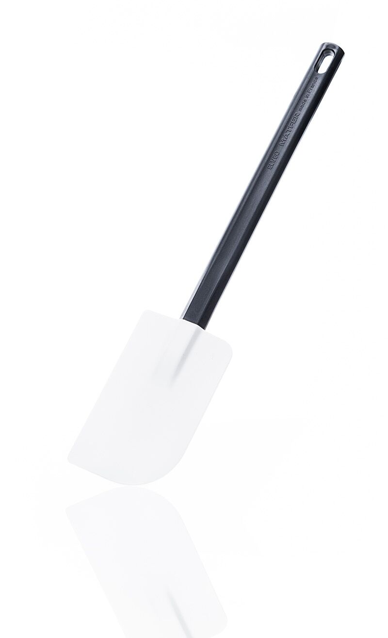 Blade made of thermoplastic elastomer, resistant to temperatures up to 500° F. Handle made of composite Exoglass polyamide. Features a square angle for easy scraping sides of containers. Dishwasher safe.